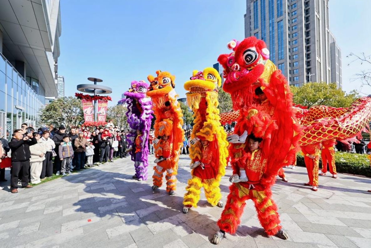 A boisterous lion dance draws big crowds at Life Hub@Anting during the nine-day Spring Festival hiatus.