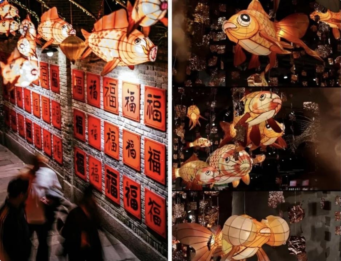 The ancient town of Zhujiajiao is lit up by fish lanterns during the holiday.
