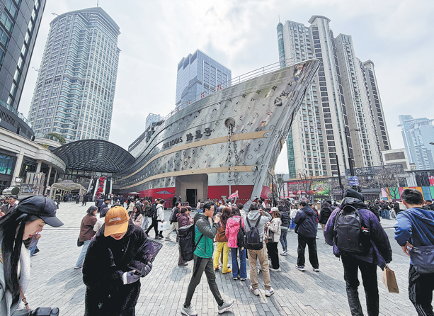 Shoppers walk past The Louis, a giant cruise ship-shaped installation by Louis Vuitton, at HKRI Taikoo Hui in Shanghai on March 19. Luxury's biggest houses reported steady growth in China at the start of 2026, signaling a continued recovery in high-end spending even as global economic and geopolitical uncertainties persist.
