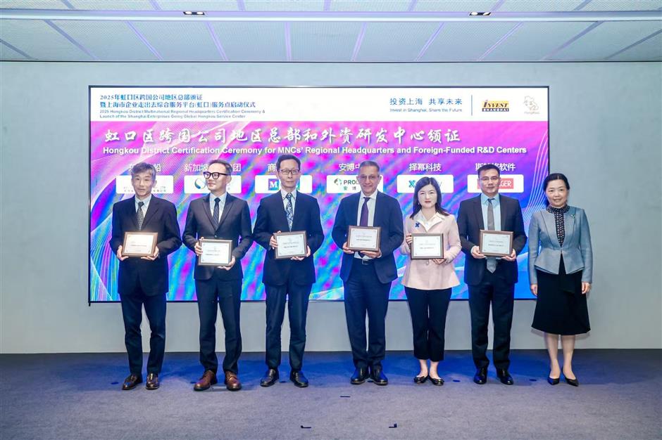 Hongkou officials presented certificates to several multinational companies establishing their regional headquarters and R&D (research and development) centers in the area, including Mitsui OSK Lines (China) Co, Prologis China and Singapore SP Group.
