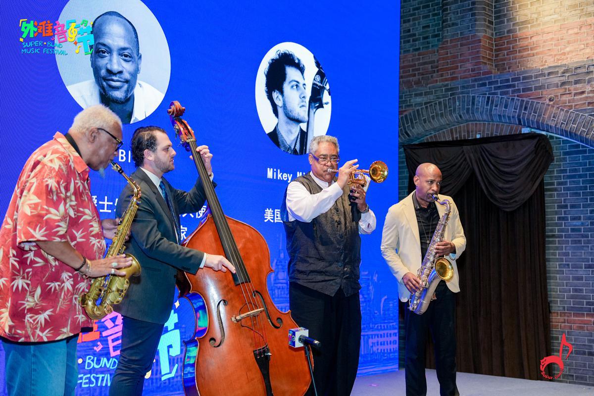 The celebrated jazz trumpeter, Jon Faddis (second from the right), and jazz bassist Mikey Migliore (second from the left) perform at the Super Bund Music Festival in Shanghai on Oct 17.