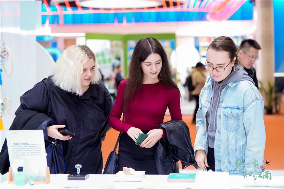 Foreign visitors admire the intangible cultural heritage products on display at Qingpu Pavilion.
