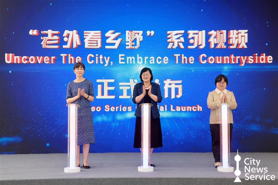 Liu Qi (left), editor-in-chief of Shanghai Daily and deputy director of Shanghai Global News Network, Shanghai United Media Group, Zhou Siqin (center), deputy director of the Publicity Department of the CPC Qingpu District Committee and director of Qingpu's information office, and Hu Xiaobin, president and chief of Oriental Urban and Rural Daily, launch the "Hidden Shanghai You Never Knew" video series.