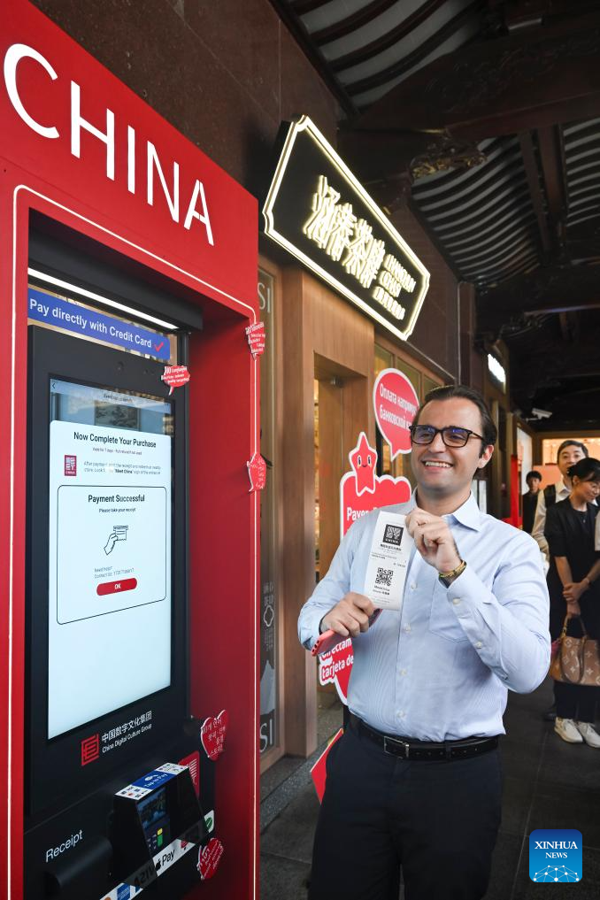 A foreign guest displays a payment receipt printed with the "Meet China" Inbound Tourism Digital Consumption Screen in Yuyuan Garden, Shanghai, east China, Sept. 27, 2025. The first national site of the "Meet China" Inbound Tourism Digital Consumption Screen was launched here on Saturday.