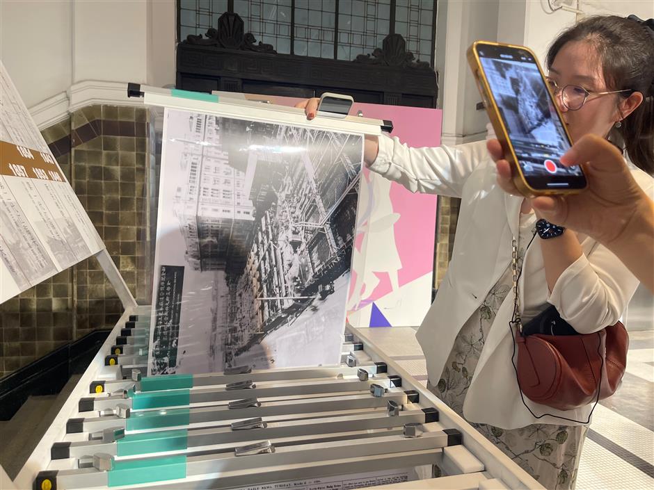 A visitor takes photos of an art installation about the citizens' memories of the landmark building.